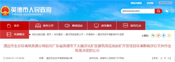 1月15日,廣東省清遠市生態環境局英德分局發布下太鎮洋坑礦區建筑用花崗巖礦開發項目環境影響評價文件擬批準決定的公示。該項目總投資30.1億元,生產規模400萬方/年,平均年產碎石448.93萬方、機制砂203.96萬方。